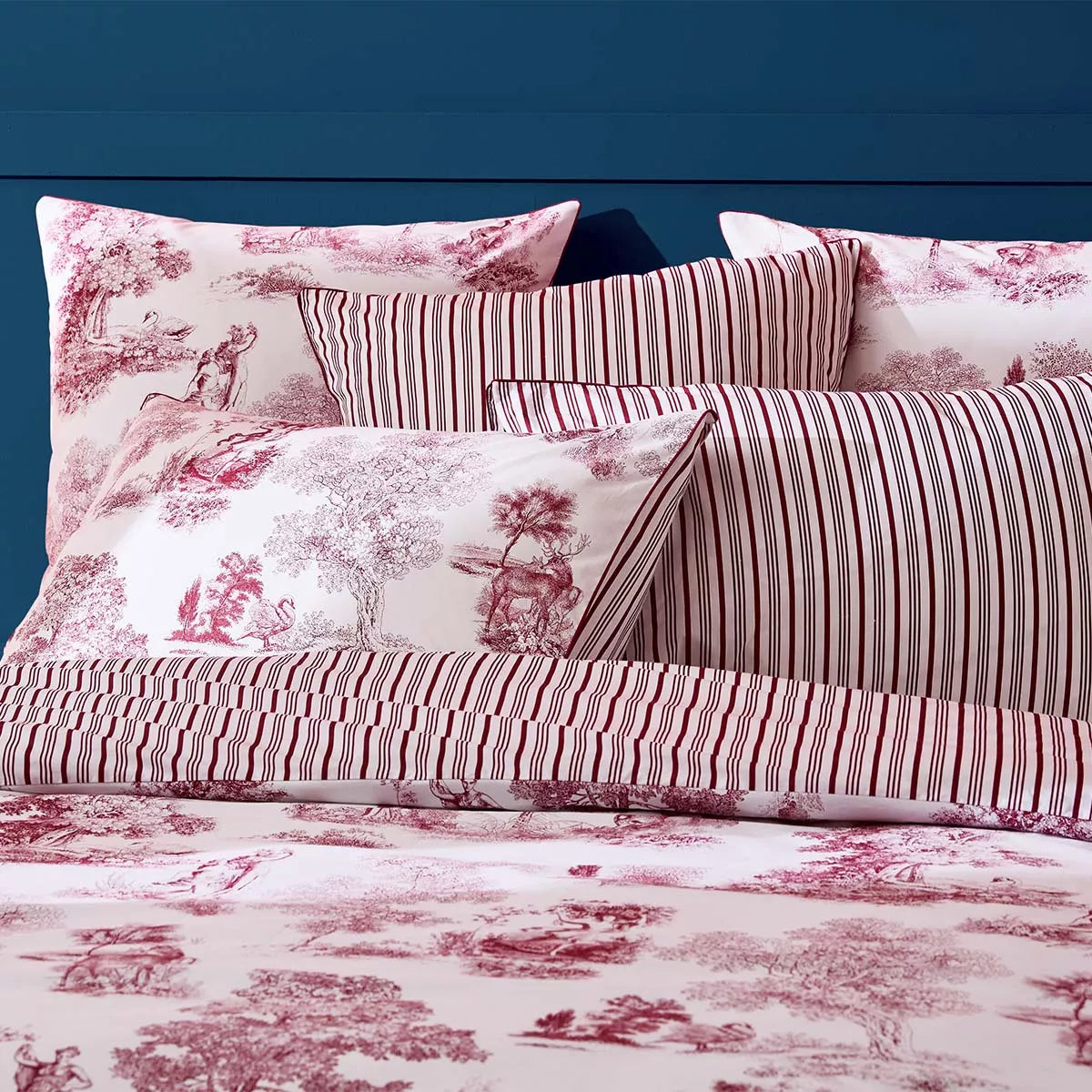 Taie d'oreiller en percale de coton 80 fils/cm², 100% coton, avec motifs de toile de Jouy imprimés en all over. Rayures verticales au verso. Qualité made in France. Linge des Vosges.